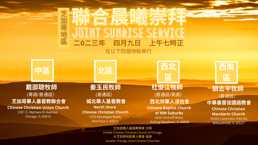 芝加哥牧者聯禱會將在復活節(4/9)芝加哥四個地區早上7:00同時舉行晨曦禮拜。北區是在城北華人基督教會,地址:1250 Waukegan Rd, Deerfield, IL 60015。 請弟兄姐妹早起一起去敬拜神,慶祝主耶穌基督的復活。 教會消息