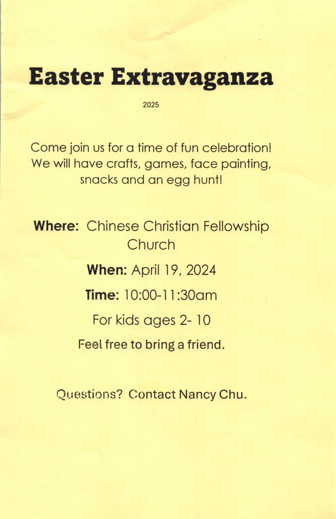 2025年4月19日(週六)教會將主辦Easter Extravaganza活動, 節目豐富, 包括復活節手工、遊戲、face painting 、小食, 和 Egg Hunt. 歡迎兩歲至十歲小朋友參加。 教會消息